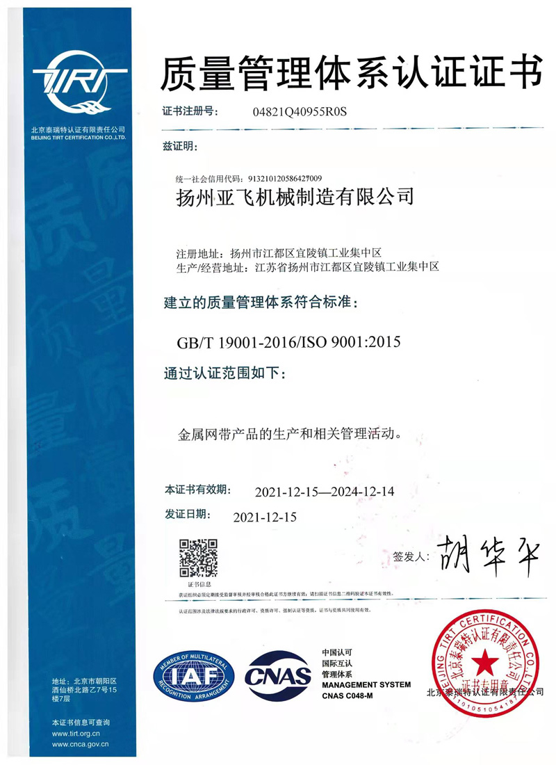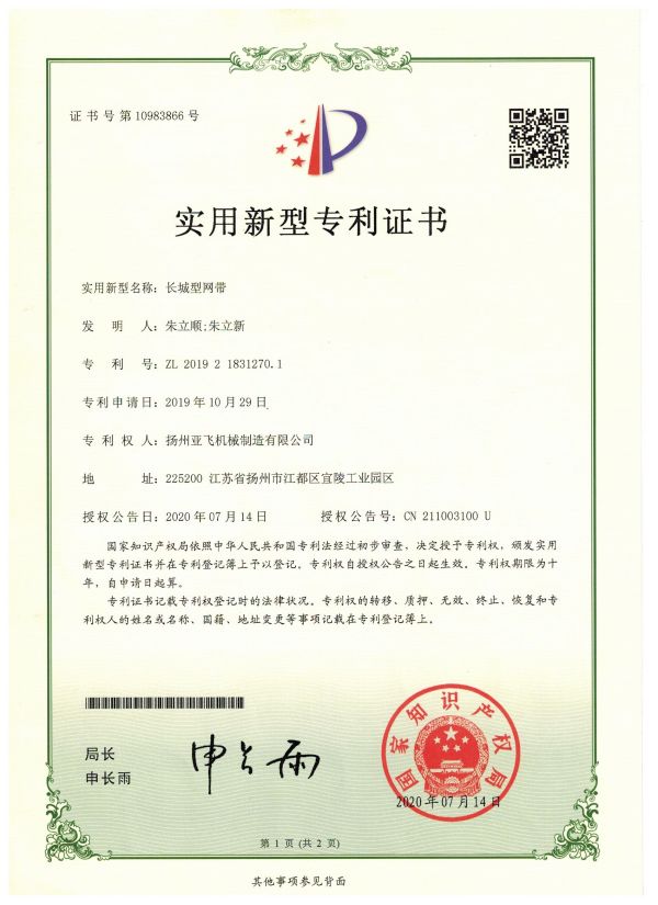 Yangzhou Yafei Machinery Manufacturing Co., Ltd. is a private scientific and technological enterprise in Jiangsu Province, formerly known as Yangzhou Yafei metal mesh belt factory. It is located in Yiling Industrial Park in the east of Yangzhou City, with R & D, production and processing, office buildings, etc. With independent research and development of scientific and technological projects and equipment processing and manufacturing capabilities.